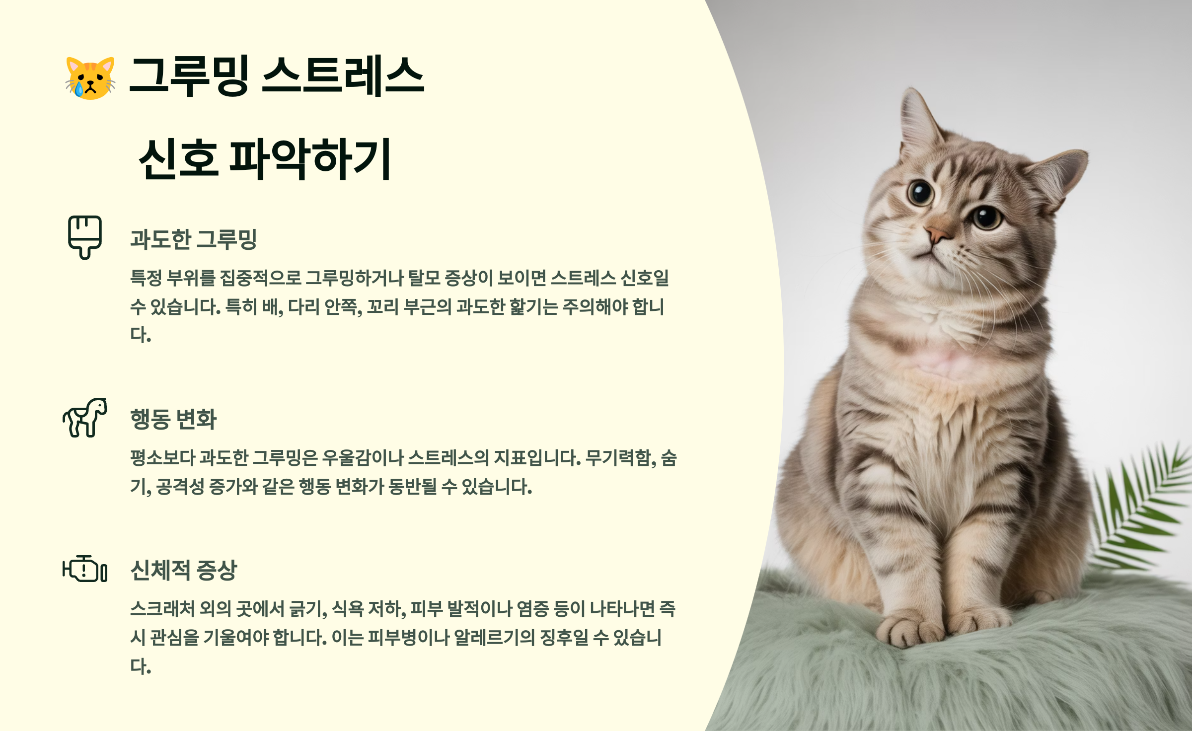 | [스트레스 케어] 고양이 그루밍 | 편안하게 관리하는 방법·팁 정리 (0) | 2025.08.24 |