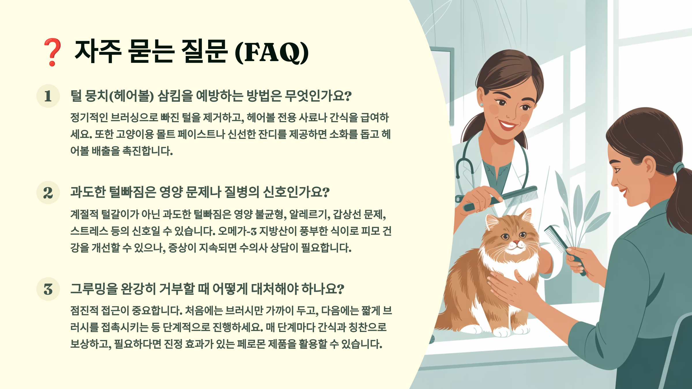 A15. 일반적으로 권장하지 않아요. 고양이 털은 체온 조절 기능이 있어 오히려 더위를 막아줘요. 심한 매트나 피부 질환이 있는 경우에만 부분 미용을 고려하세요. 라이언 컷 같은 전신 미용은 고양이에게 스트레스가 크고, 일광화상 위험도 있어요. 대신 규칙적인 브러싱으로 속털을 제거해주세요.