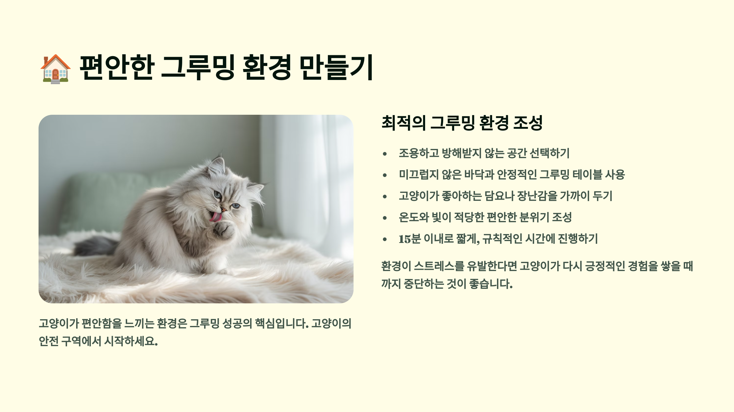 아무리 좋은 브러쉬를 준비해도 환경이 적절하지 않으면 고양이는 스트레스를 받을 수밖에 없어요. 그루밍 환경 조성은 성공적인 그루밍의 절반이라고 할 수 있죠. 고양이가 안전하고 편안하게 느낄 수 있는 공간을 만드는 것부터 시작해볼게요. 작은 디테일 하나하나가 큰 차이를 만든답니다! 🏡