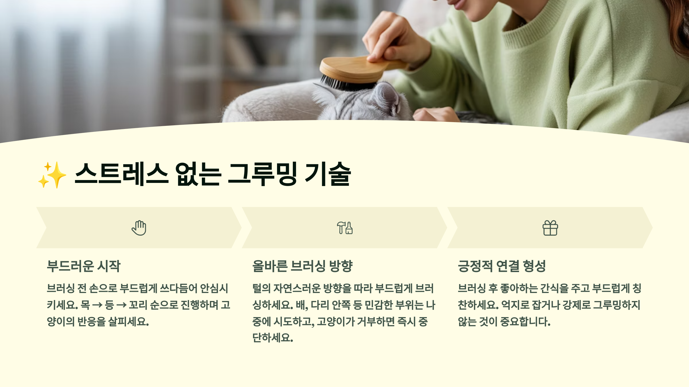 스트레스에 극도로 민감한 고양이는 그루밍 전 준비 운동(?)이 필요해요. 좋아하는 장난감으로 10-15분 정도 놀아준 후, 약간 지쳤을 때 그루밍을 시작하면 저항이 줄어들어요. 또한 그루밍 장소에 고양이가 좋아하는 담요나 쿠션을 깔아두면 안정감을 느껴요. 캣닢이나 마따따비를 살짝 뿌려두는 것도 효과적이에요.