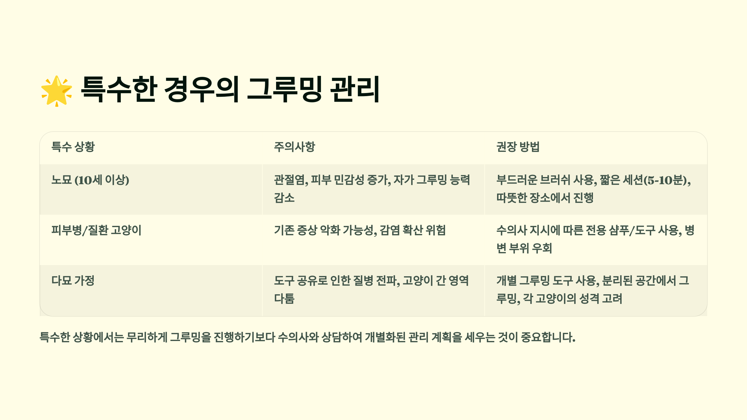 모든 고양이가 똑같은 그루밍 방법으로 관리될 수는 없어요. 품종, 건강 상태, 성격, 과거 경험 등에 따라 특별한 접근이 필요한 경우가 많죠. 이번에는 일반적인 방법으로는 해결하기 어려운 특수한 상황들과 그에 맞는 맞춤형 그루밍 전략을 소개해드릴게요. 어려운 케이스도 포기하지 마세요! 🌟
