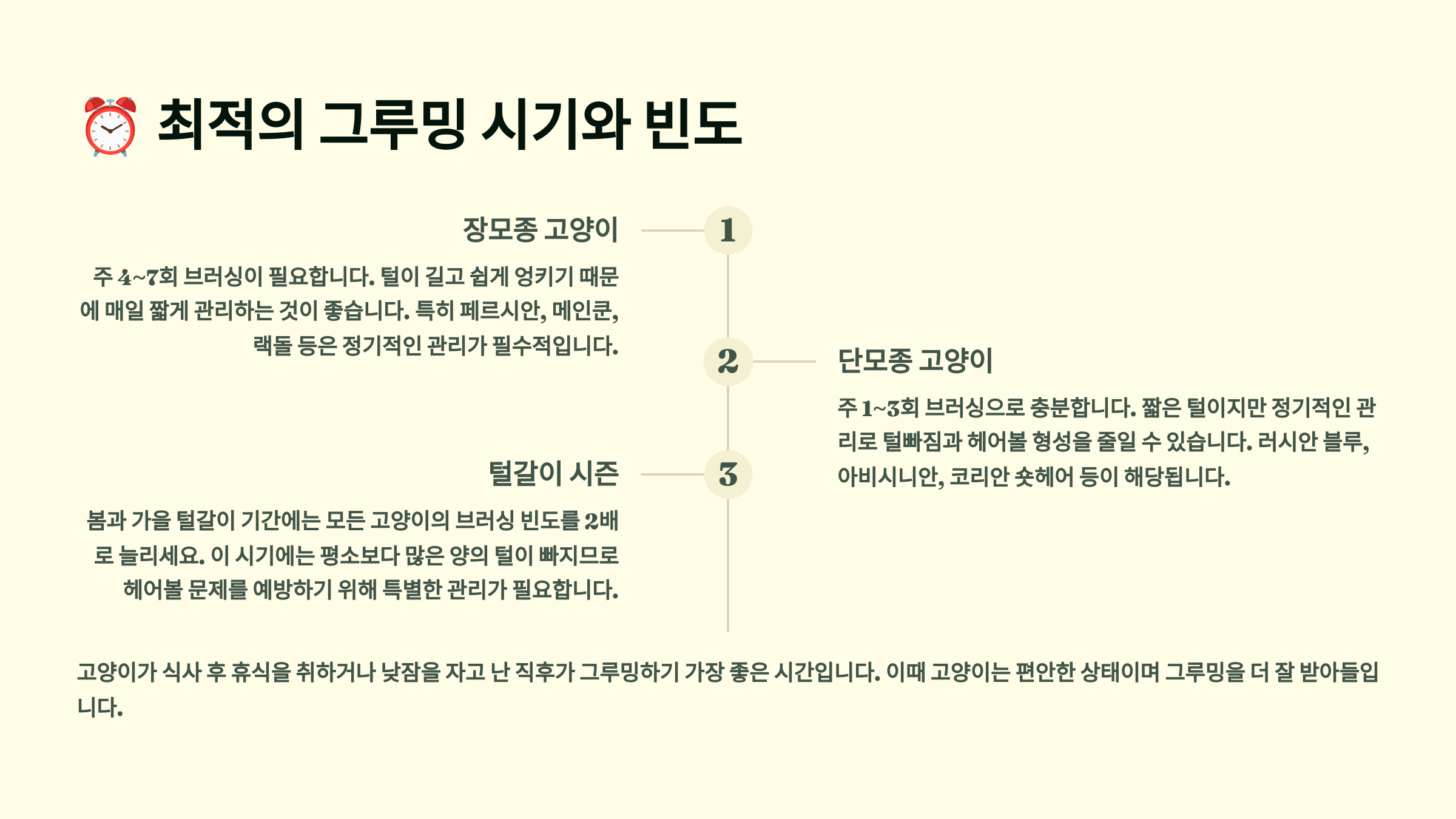 그루밍을 언제, 얼마나 자주 해야 할지 고민되시죠? 사실 정답은 없어요. 고양이마다 털의 상태, 생활 환경, 건강 상태가 다르기 때문이에요. 하지만 일반적인 가이드라인은 있답니다. 계절별, 나이별, 상황별로 최적의 그루밍 타이밍을 알려드릴게요. 이 정보를 바탕으로 우리 고양이에게 맞는 스케줄을 만들어보세요! ⏰