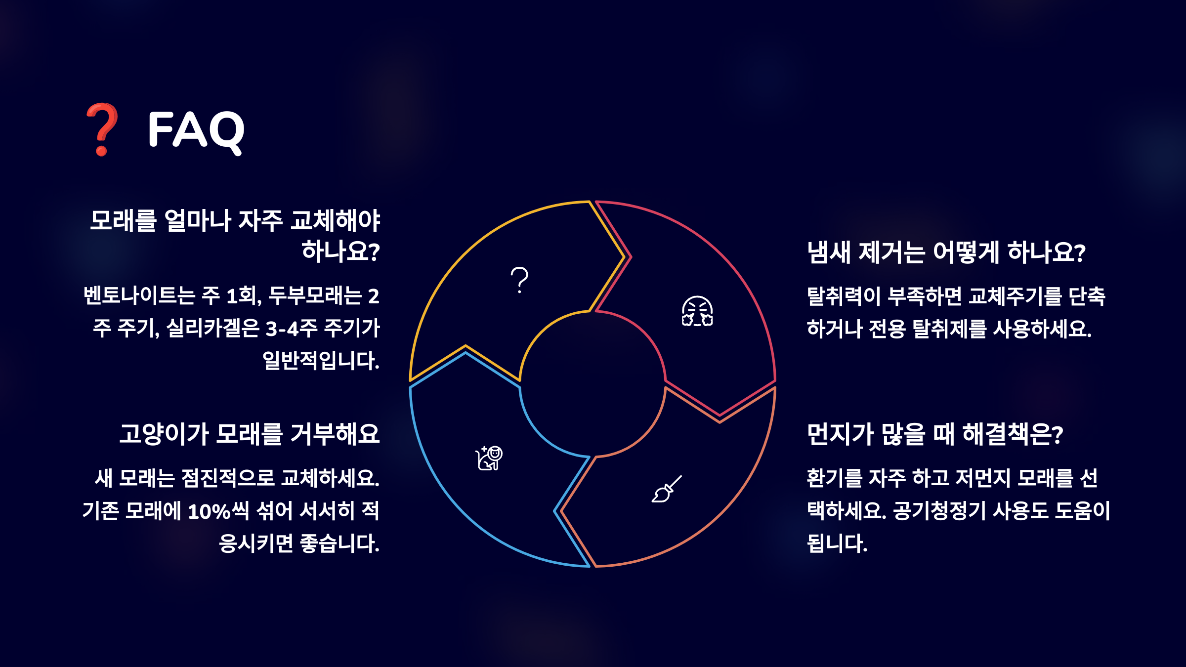 올바른 사용법과 꾸준한 관리로 우리 고양이가 항상 깨끗한 화장실을 사용할 수 있도록 해주세요! 📚