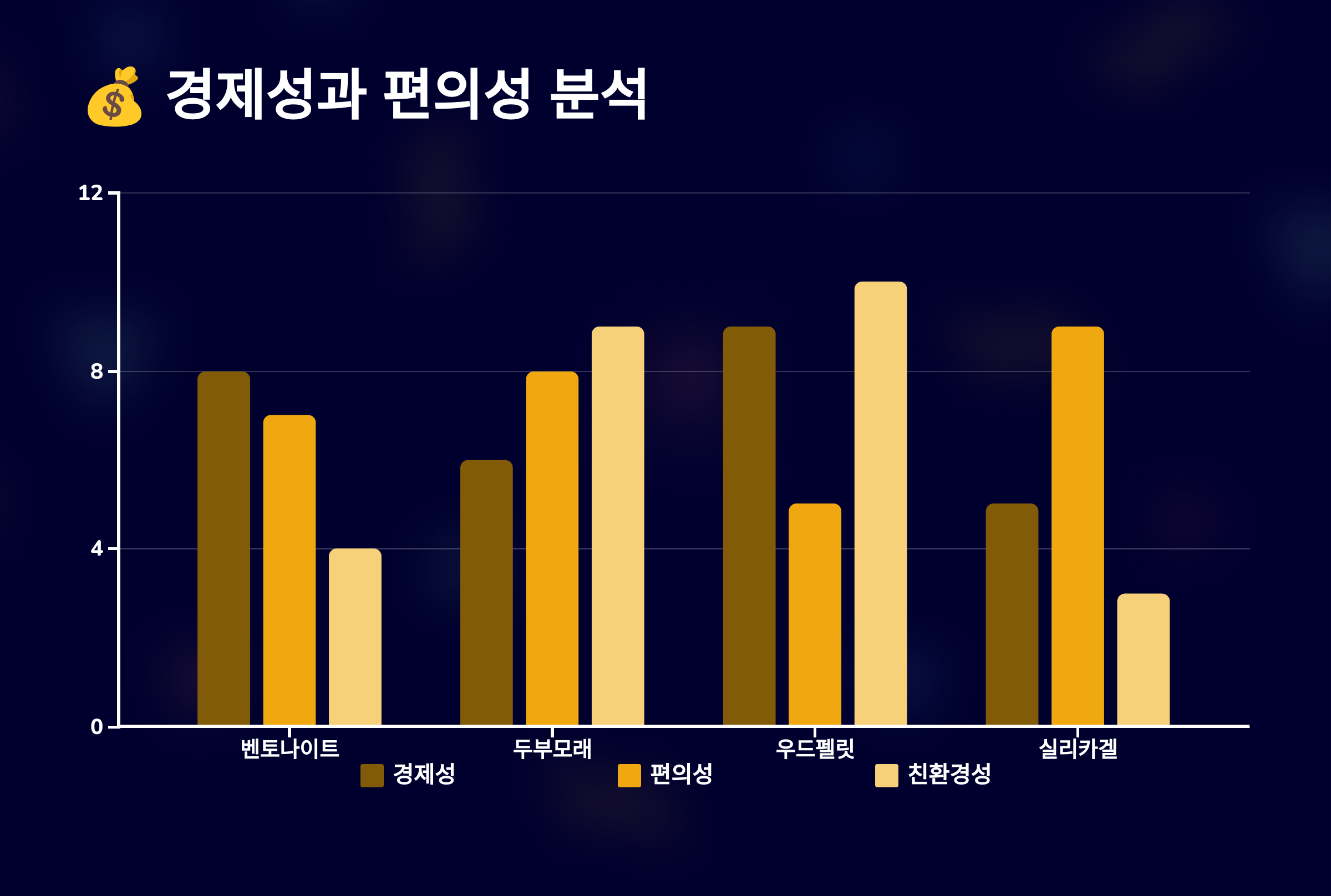 친환경 모래들은 대체로 가격이 높은 편이에요. 두부 모래는 월 평균 25,000-30,000원, 옥수수 모래는 20,000-25,000원 정도의 비용이 들어요. 하지만 화장실에 버릴 수 있어서 쓰레기 처리 비용과 수고를 줄일 수 있고, 환경 비용까지 고려하면 가치가 있다고 볼 수 있어요. 나무 펠릿은 상대적으로 저렴한 편이지만 교체 주기가 짧아서 전체 비용은 비슷해져요. 각 가정의 경제 상황과 가치관을 고려해서 선택하는 것이 중요해요.