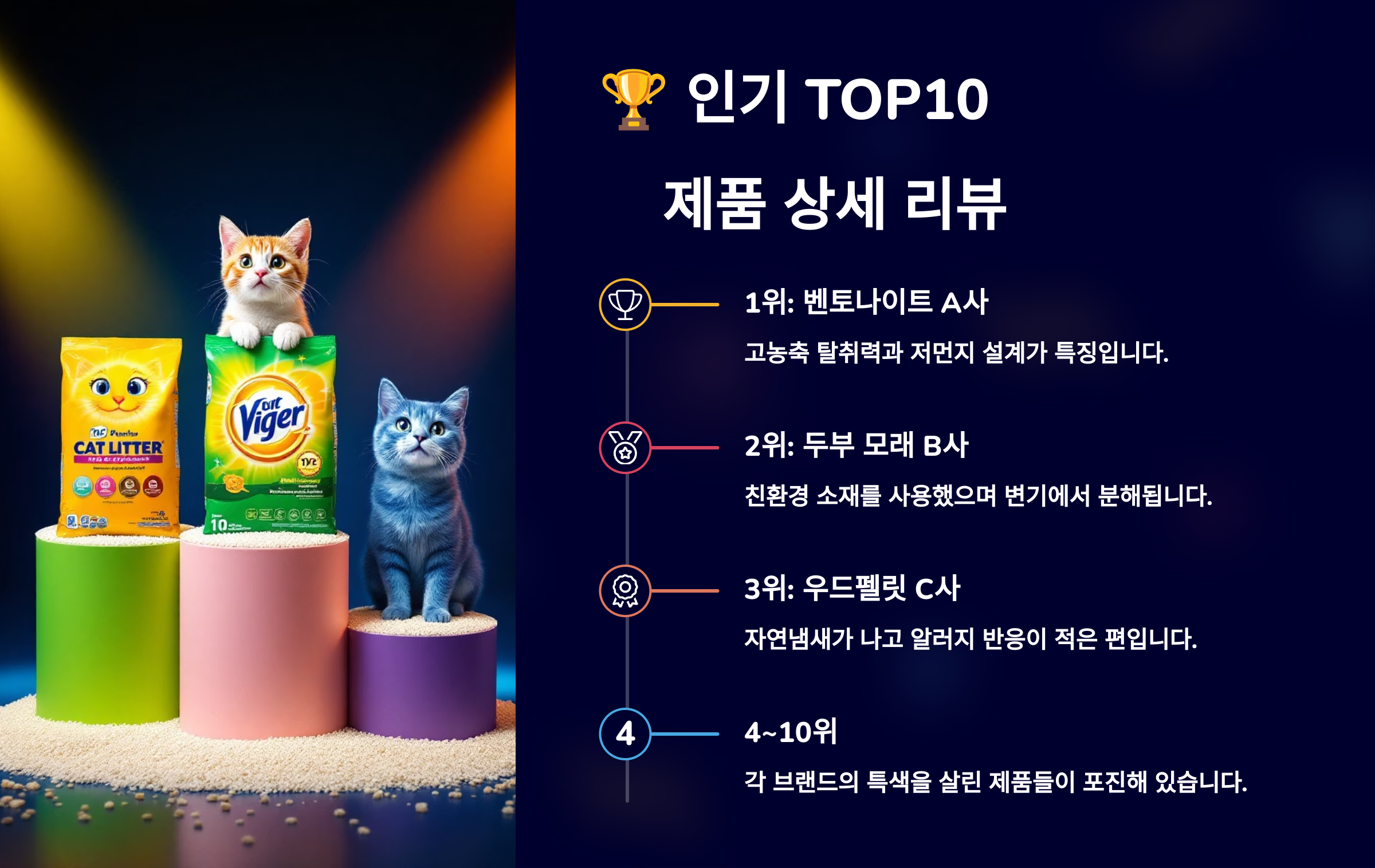 각 제품마다 특색이 다르니까 우리 고양이의 취향과 집안 환경을 고려해서 선택하는 게 좋아요! 🏆