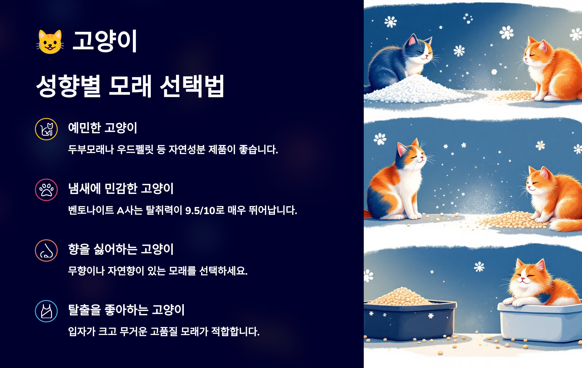 | 고양이 성향 | 추천 모래 | 고려사항 |