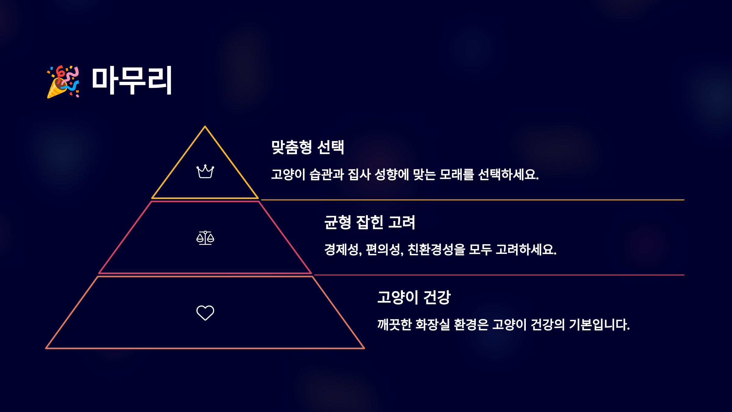 모래 종류별로 특성이 확연히 다르니까 우리 고양이의 성향과 환경을 고려해서 선택하는 게 중요해요! 🏖️