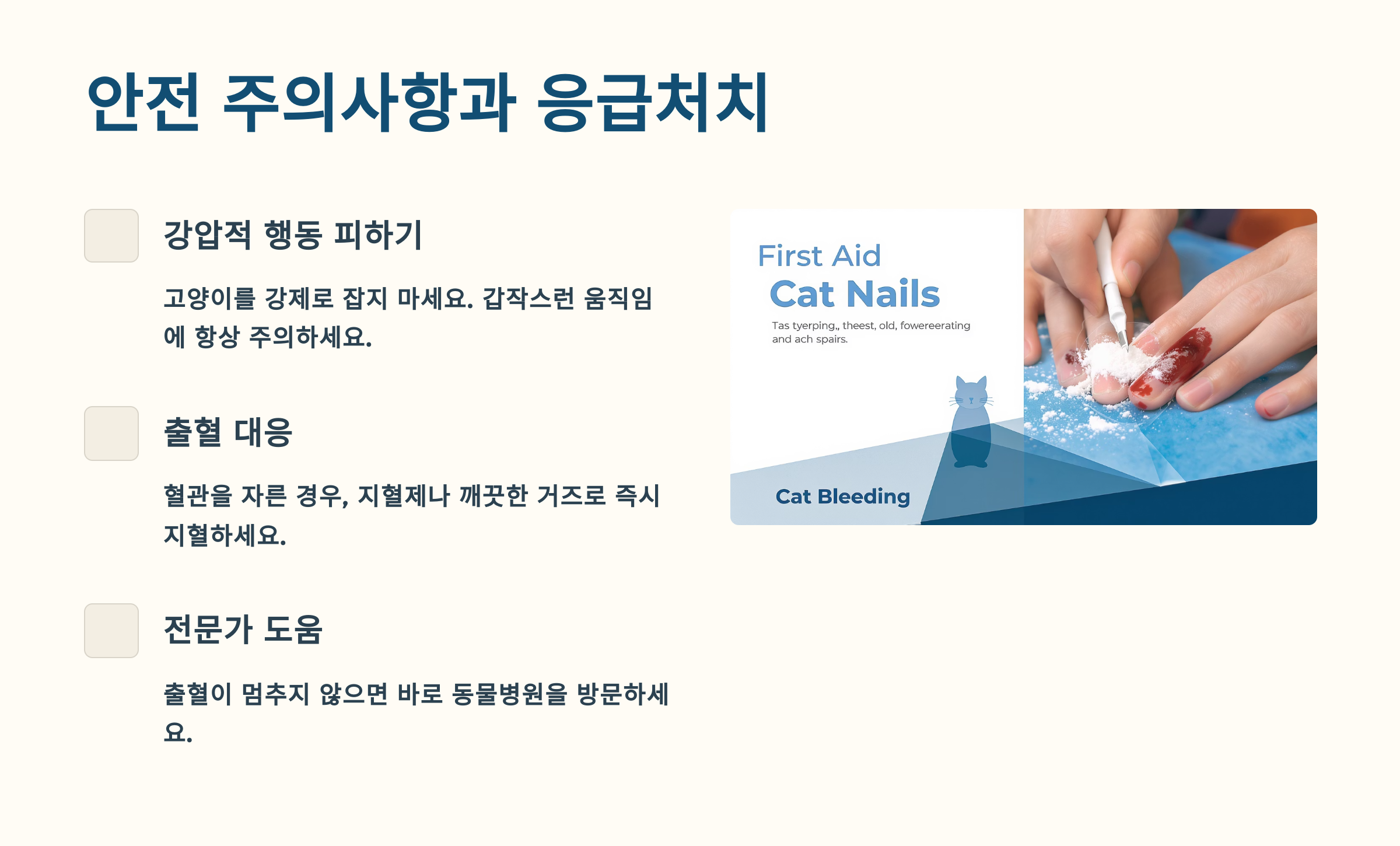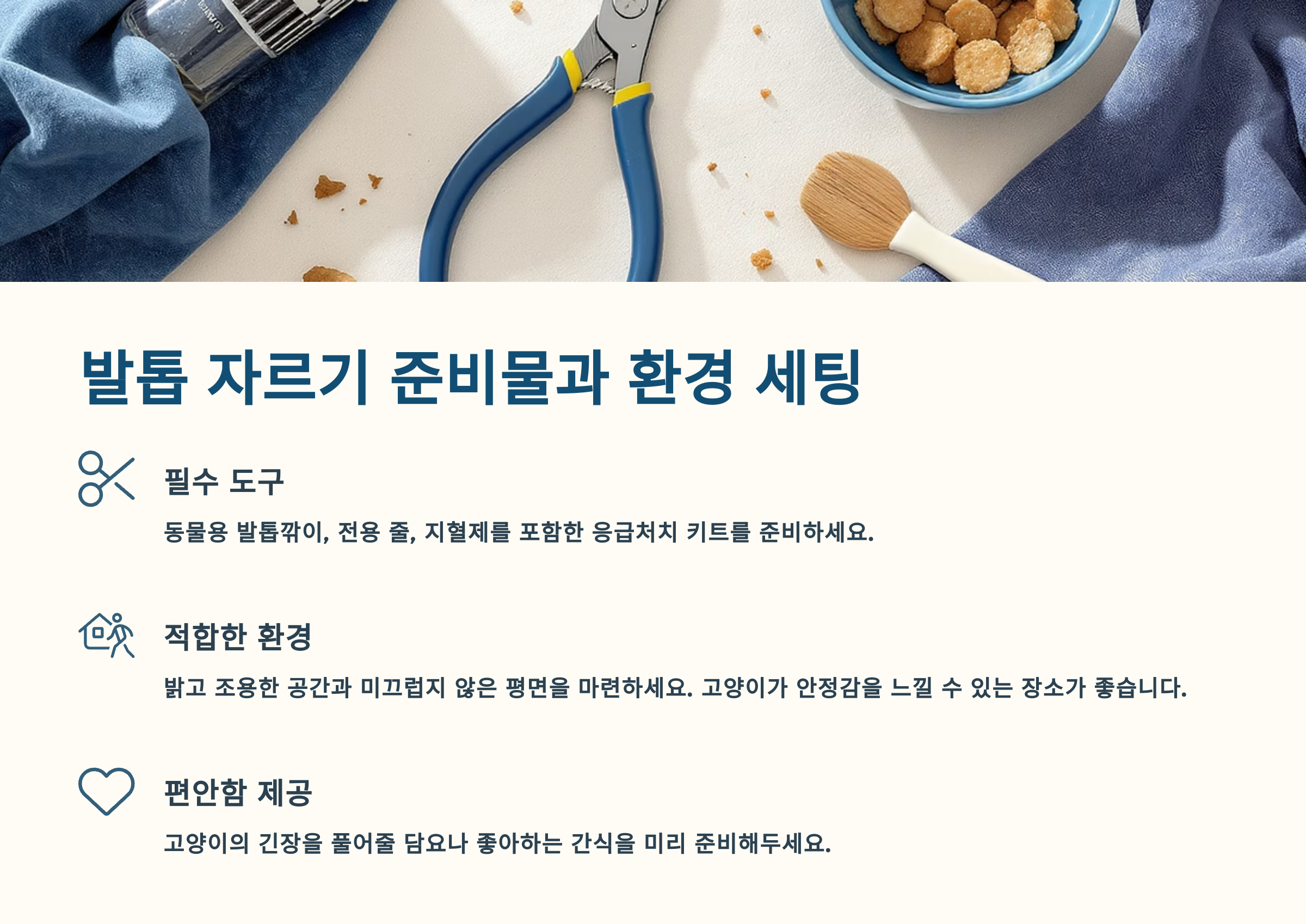 마지막으로 응급 상황에 대비한 준비도 필요해요. 가까운 동물병원 연락처를 미리 저장해두고, 출혈이 멈추지 않을 경우를 대비해 깨끗한 거즈나 붕대도 준비하세요. 대부분의 경우 큰 문제없이 끝나지만, 만일의 상황에 대비하는 것이 현명한 집사의 자세랍니다! 🏥