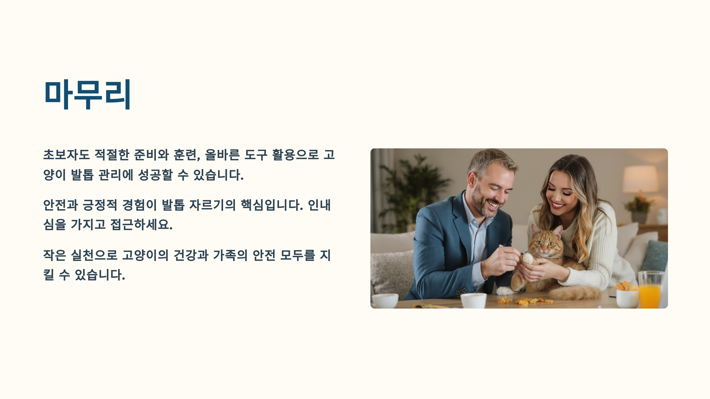 정기적인 발톱 관리는 고양이의 건강과 행복을 위해 꼭 필요한 일이에요. 발톱이 건강해야 고양이가 편안하게 생활할 수 있고, 집사와의 관계도 더 좋아질 수 있어요. 오늘 배운 내용을 바탕으로 여러분의 고양이에게 맞는 최적의 방법을 찾아보세요.