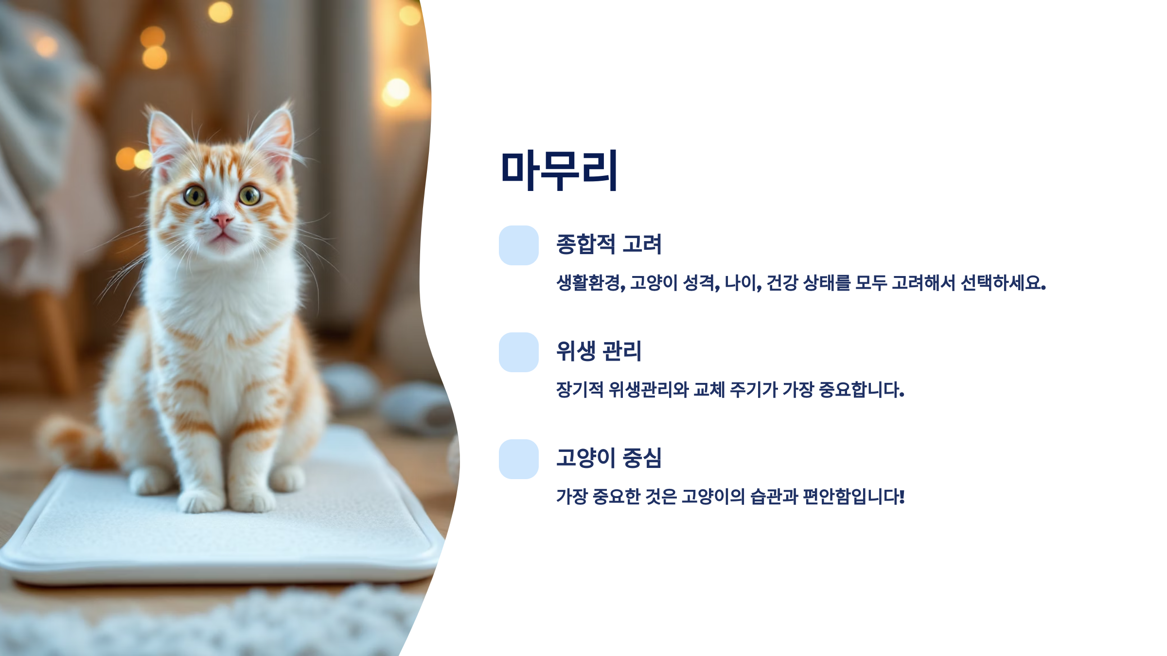 모래 선택은 고양이의 선호도와 집사의 관리 스타일을 모두 고려해야 최적의 결과를 얻을 수 있어요 💡
