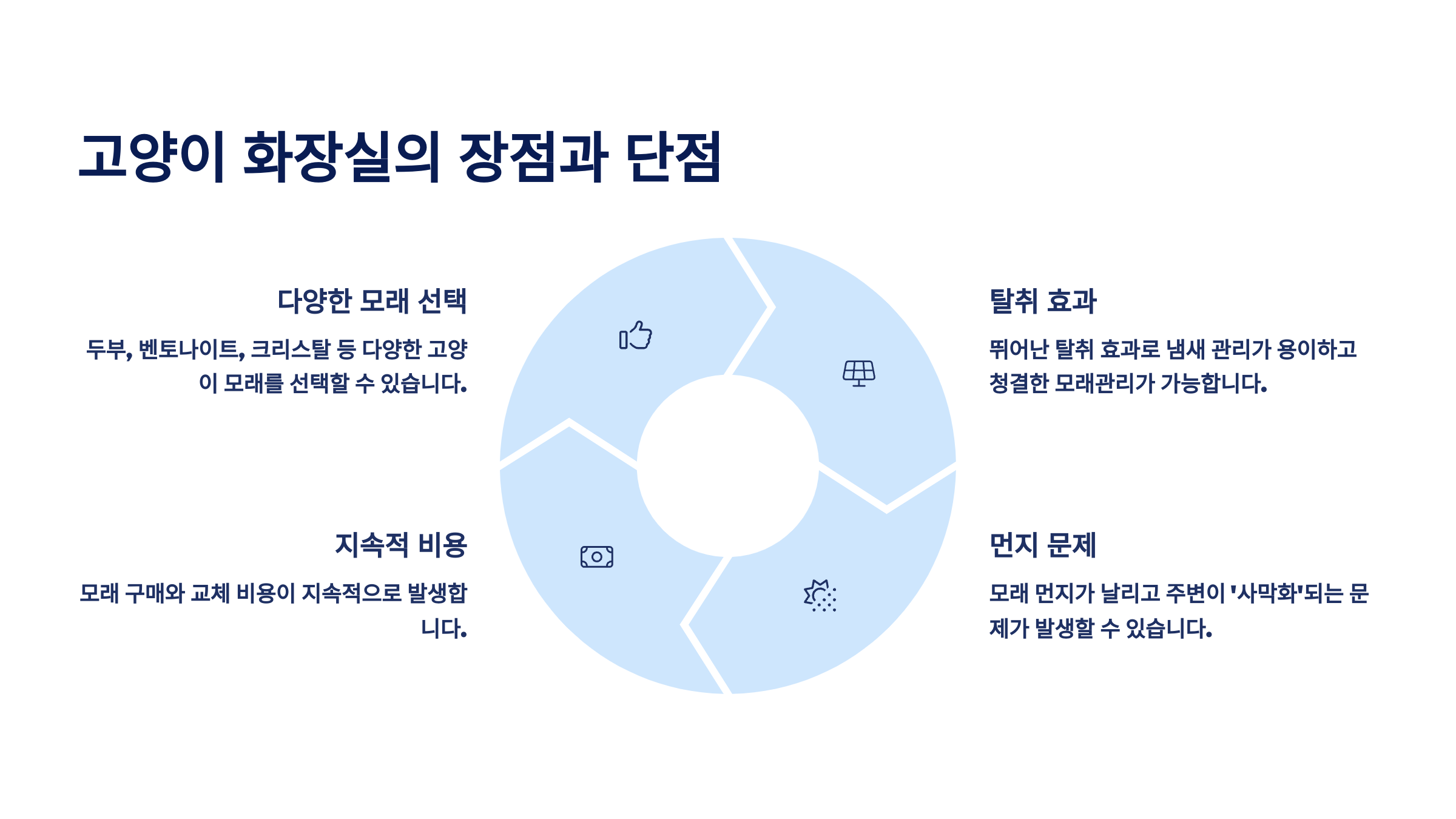 장기적으로 보면 모래 화장실이 더 경제적이지만, 라이프스타일에 따라 편의성의 가치도 고려해야 해요 📊