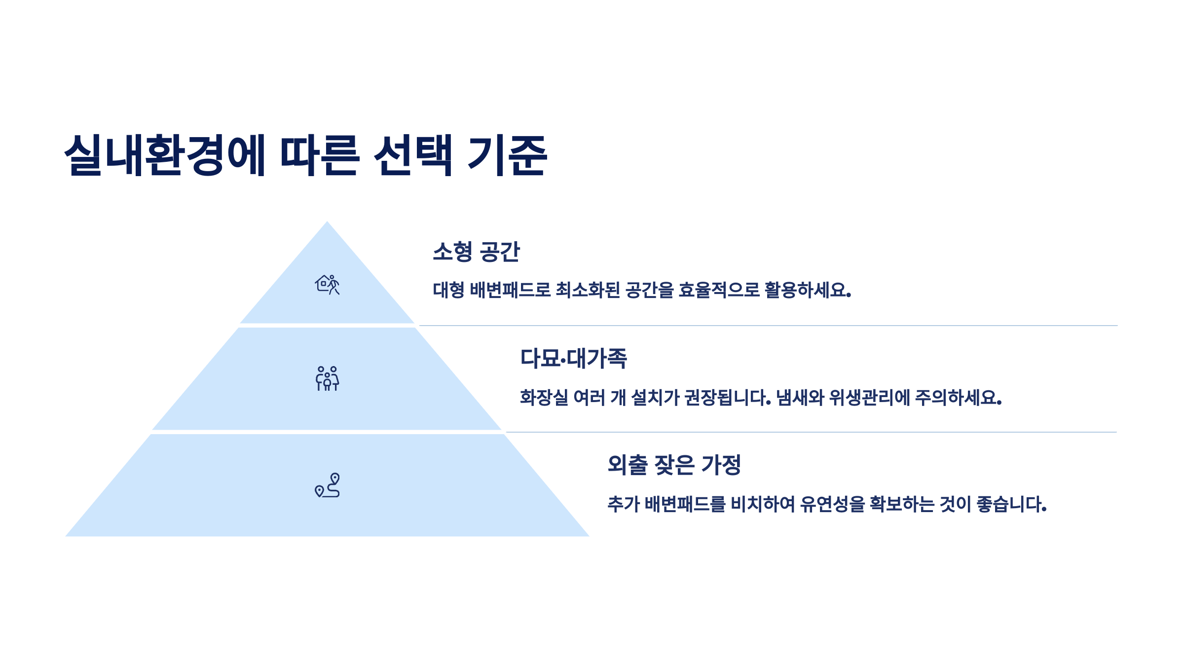 | 원룸/오피스텔 | 좁음, 환기 제한 | 배변패드 | 냄새 관리 중요 |