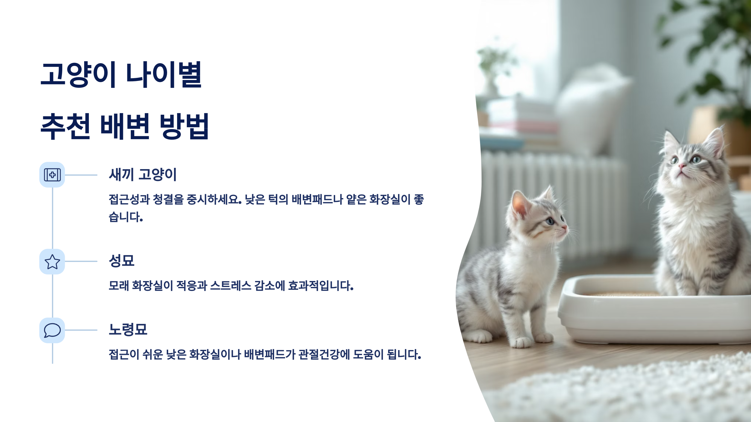 고양이의 나이와 건강 상태를 고려한 맞춤형 배변 환경을 제공하는 것이 가장 중요해요 🎂