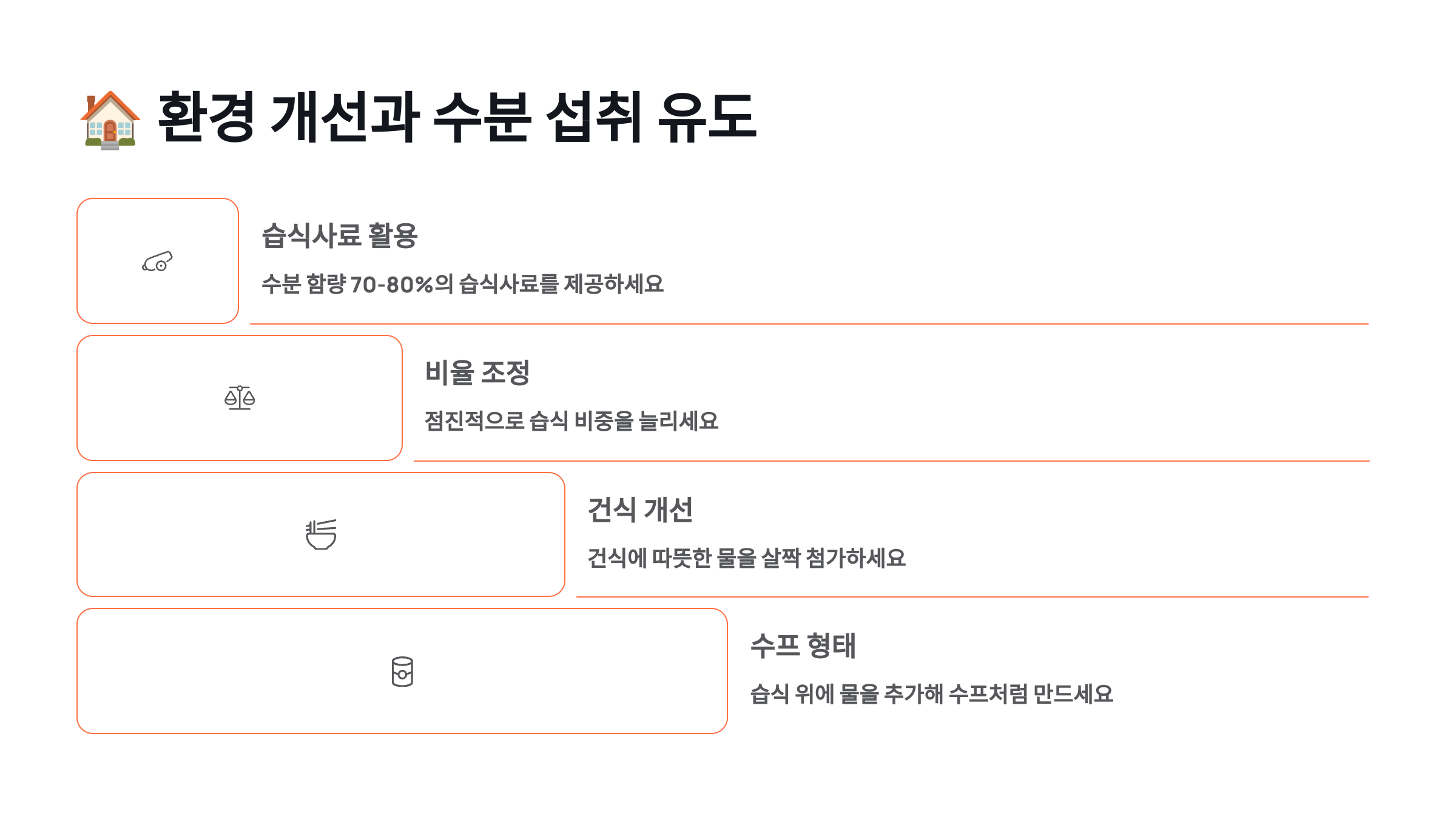 | 사료에 물 섞기 | 50-100% | 쉬움 | 낮음 |