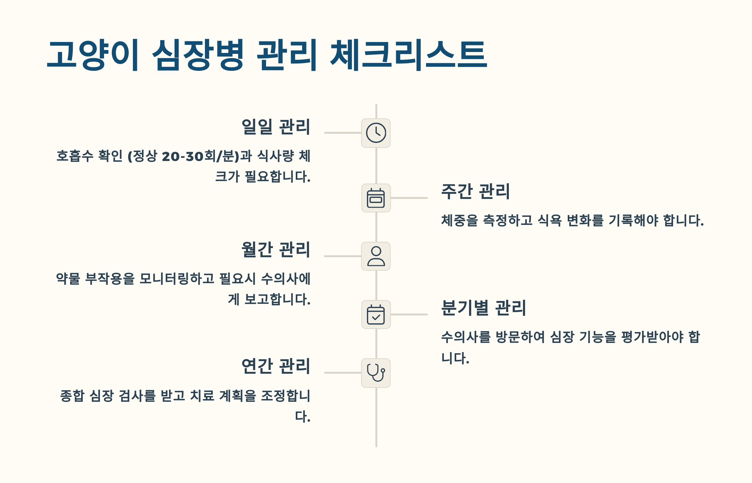 고양이 심장병 관리는 복잡해 보이지만, 하나하나 꼼꼼히 체크하면 어렵지 않아요! 🐱✅