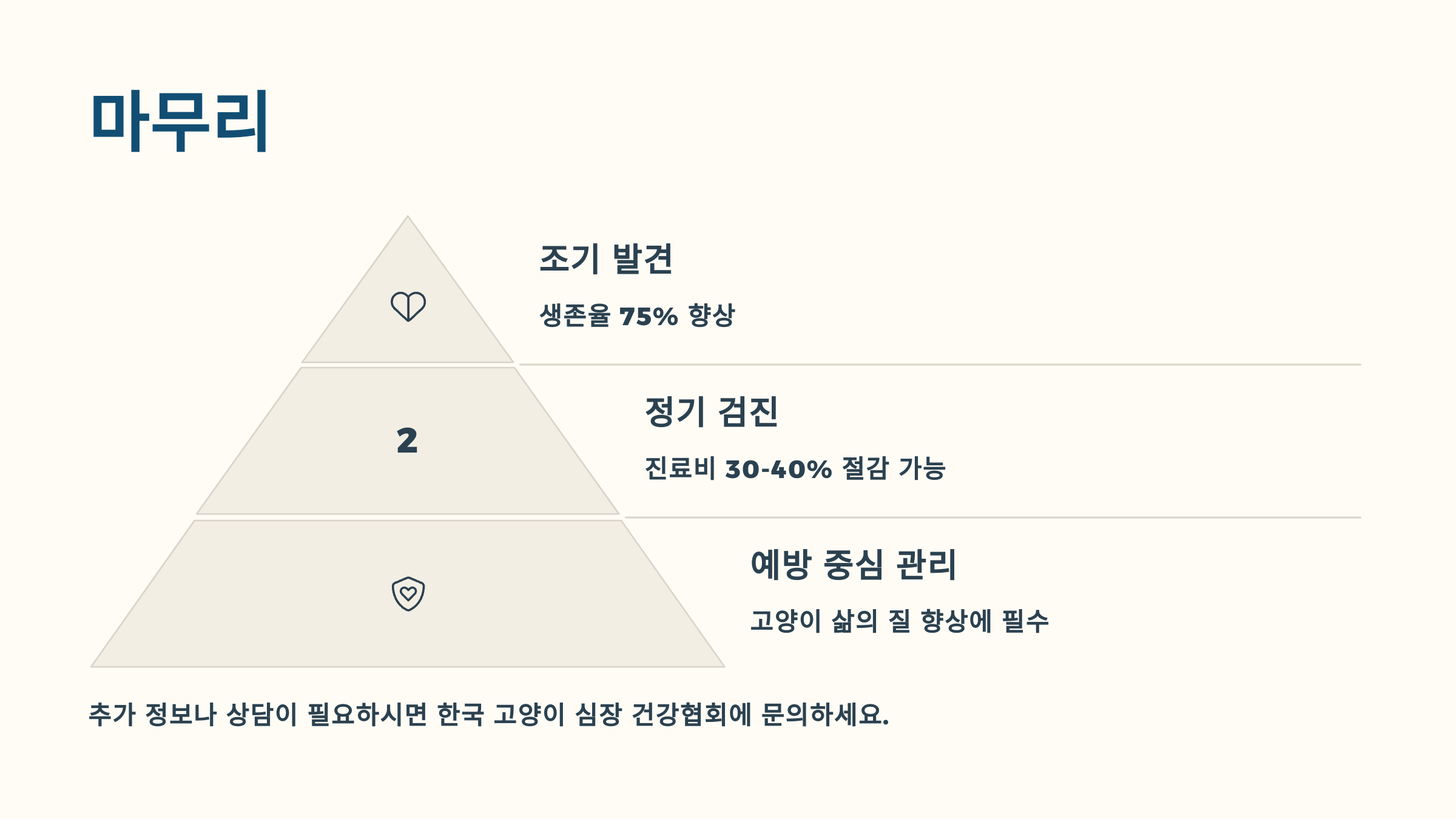 "예방은 치료보다 쉽고, 더 값진 선택"이라는 말처럼 고양이의 작은 일상부터 신경 써주세요. 건강한 심장은 매일의 행복으로 이어져요! 🐾💓