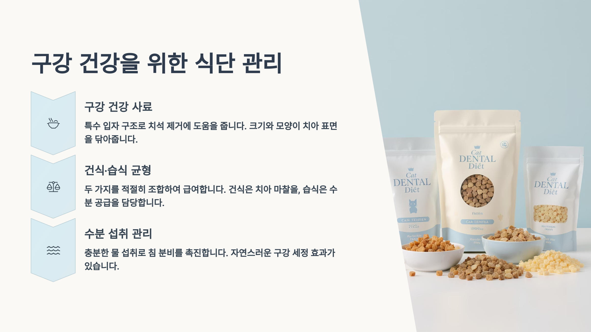 | 덴탈 사료 | 플라크 제거 | 당분 많은 간식 | 충치 유발 |