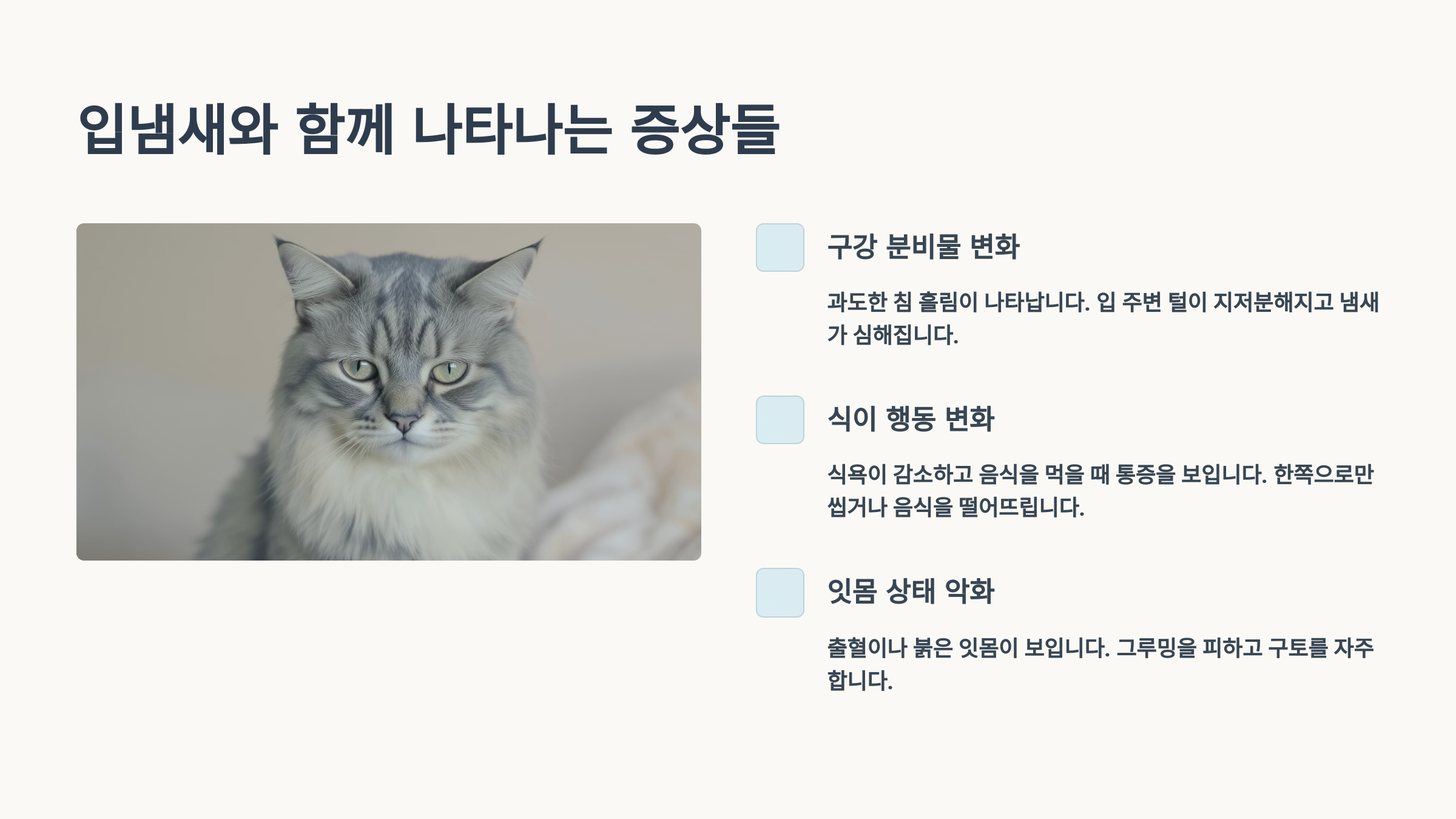 기억하세요, 고양이는 아픔을 잘 표현하지 않아요. 그래서 보호자의 세심한 관찰과 예방이 더욱 중요해요. 오늘부터라도 우리 고양이의 입 냄새를 한 번 맡아보고, 구강 상태를 확인해보는 건 어떨까요? 작은 관심이 큰 건강을 만든답니다. 건강한 구강으로 더 오래오래 함께 행복한 시간을 보내시길 바라요! 😺