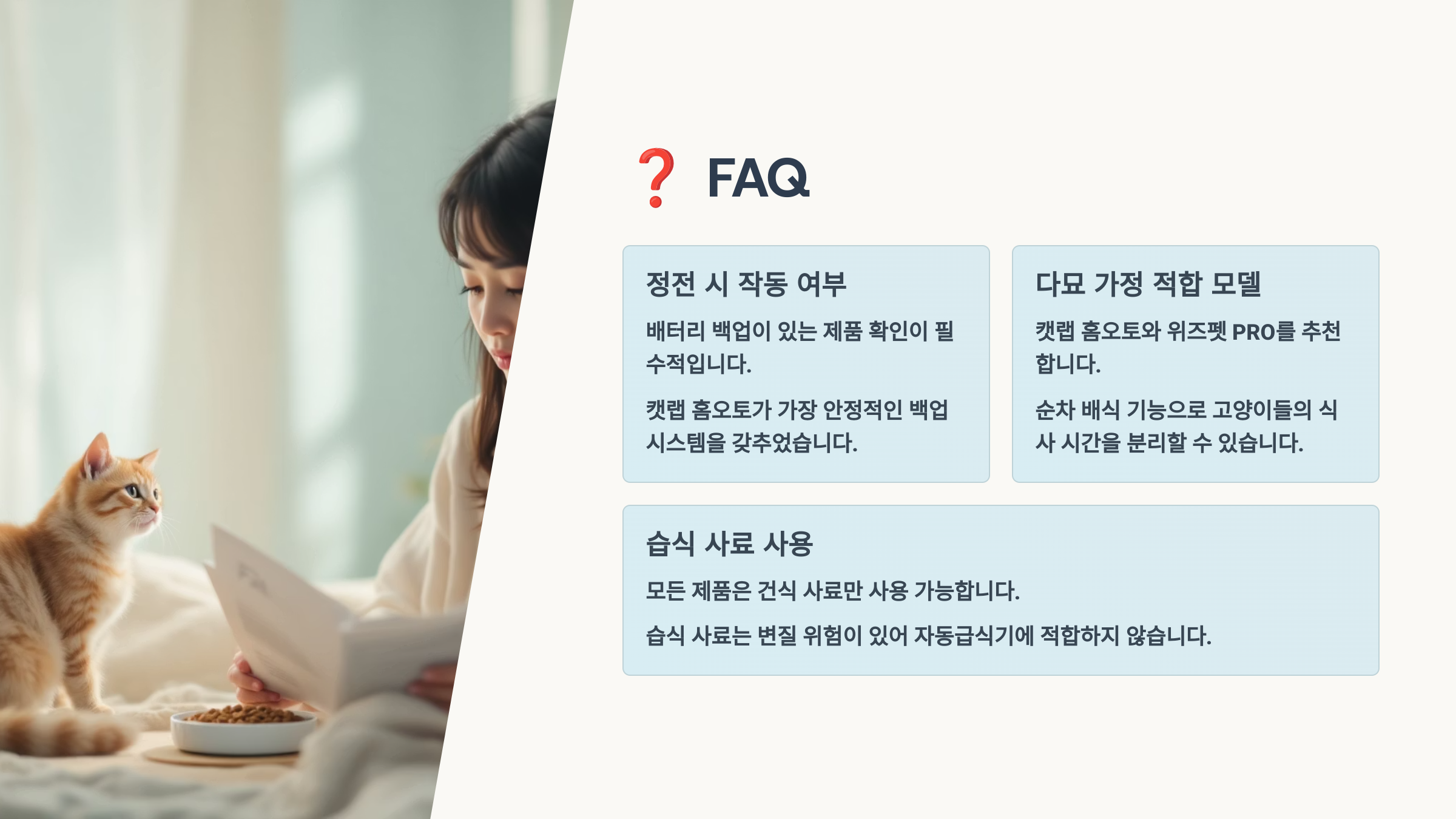 기능이 많고 비싸다고 해서 반드시 좋은 제품은 아니에요. 기본 기능이 충실하고 안정적으로 작동하는 제품이 때로는 더 나은 선택일 수 있어요. 구매 전에 우리 집 환경, 고양이의 성격과 식습관, 집사의 라이프스타일을 종합적으로 고려해서 결정하세요.