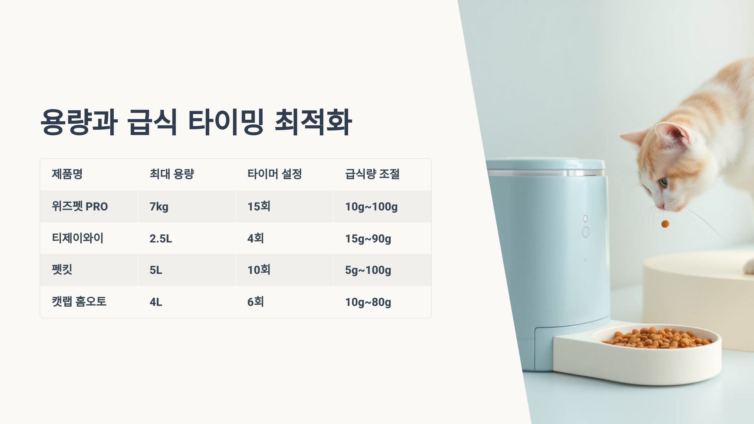 자동급식기 선택 시 고려해야 할 핵심 요소들이 있어요. 첫 번째는 용량인데, 고양이 한 마리 기준으로는 2~4kg 정도가 적당하고, 다묘 가정이라면 더 큰 용량이 필요해요. 두 번째는 급식 횟수와 시간 설정 기능이에요. 하루 2~6회 정도 설정할 수 있는 제품이 일반적이고, 시간당 1~2분 정도의 오차는 허용 범위예요. 세 번째는 사료 크기 호환성인데, 일반 건사료부터 대형 사료까지 다양한 크기에 대응할 수 있는지 확인해야 해요.