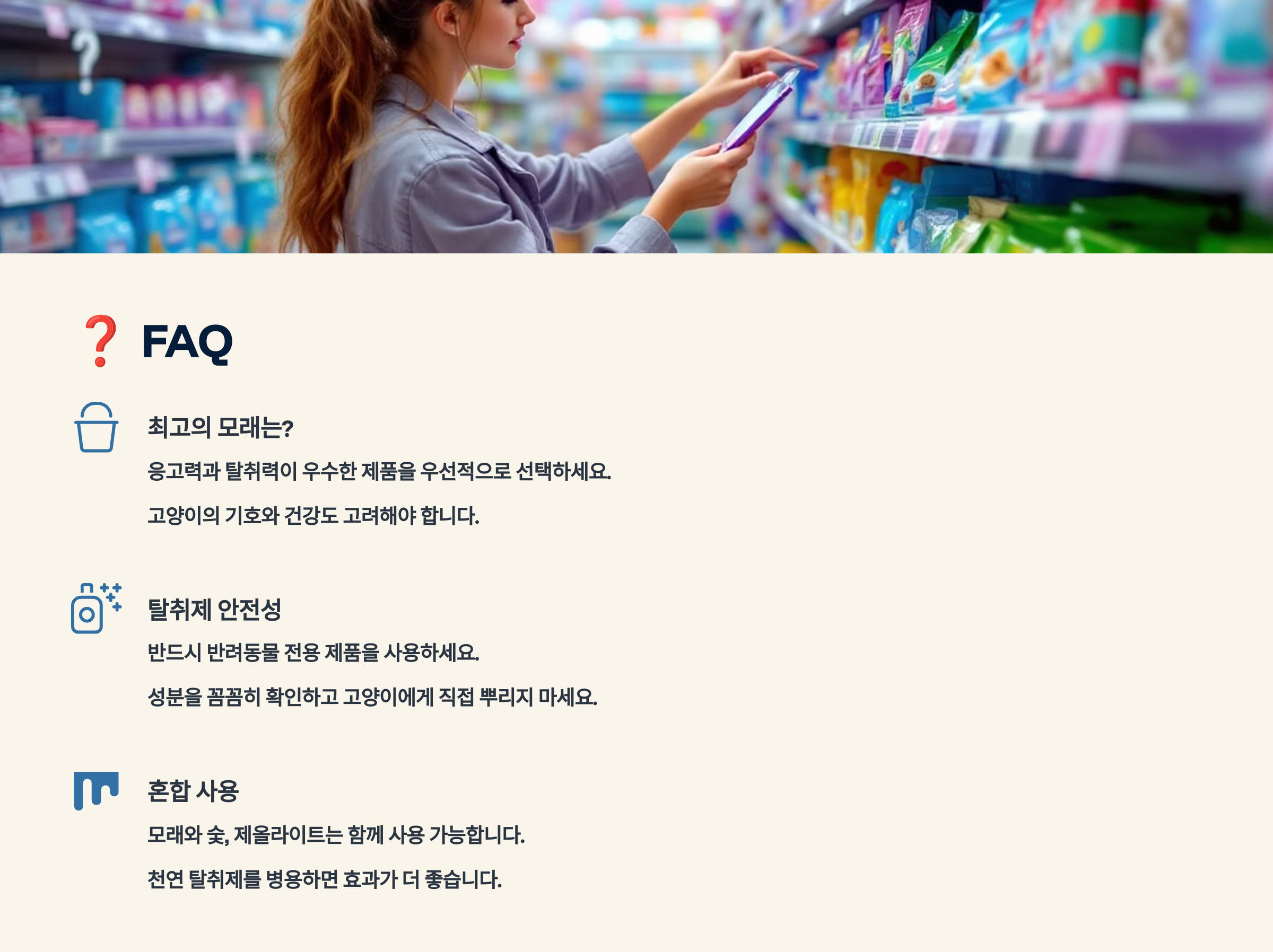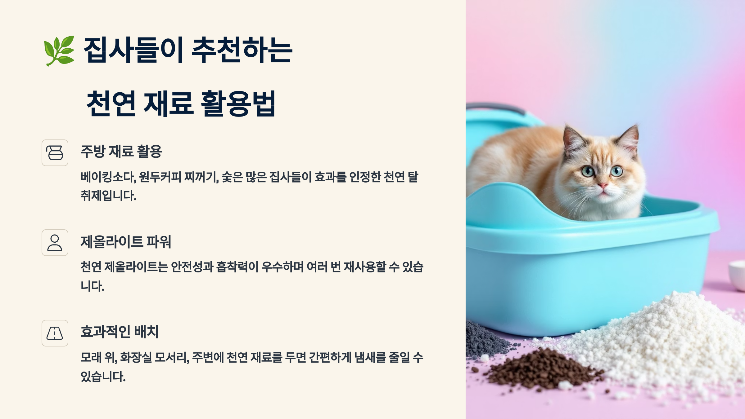 | 베이킹소다 | 냄새 중화 | 모래에 뿌리기 | 주 2-3회 |