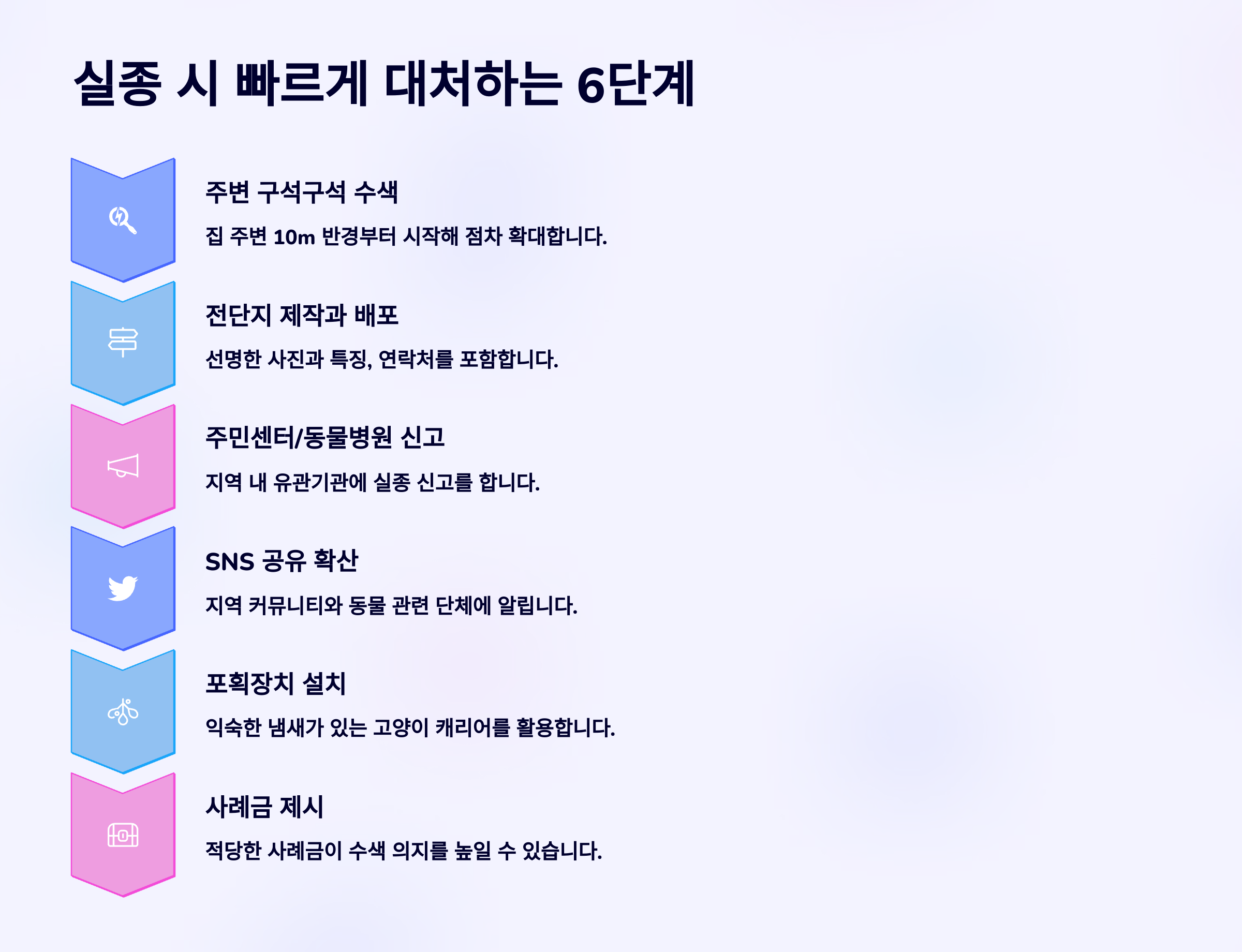 고양이가 사라졌다면, 무작정 돌아다니는 것보다 구조 흐름에 맞게 순서대로 대응하는 게 중요해요. 특히 실종 후 1~3시간 이내에는 대부분 반경 100m 내에 머물기 때문에 시간 낭비 없이 집중 탐색이 필요해요! 🕵️♀️