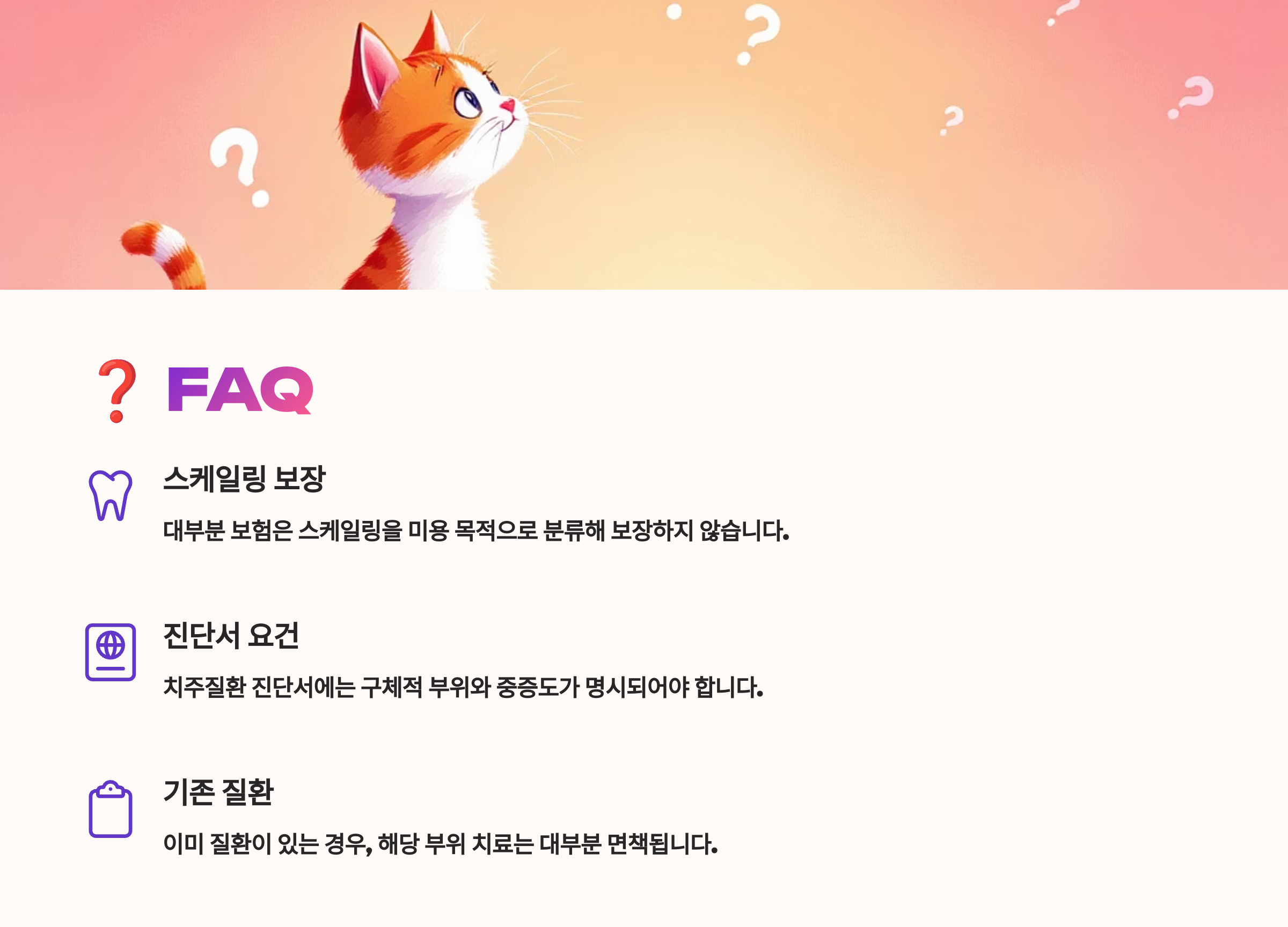 💡 내가 생각했을 때, 고양이 보험에서 치과 치료 보장 여부는 꼭 확인해야 할 핵심이에요. 오늘은 발치부터 스케일링, 치은염까지 어디까지 보장되는지 하나하나 자세히 알려줄게요! 🦷