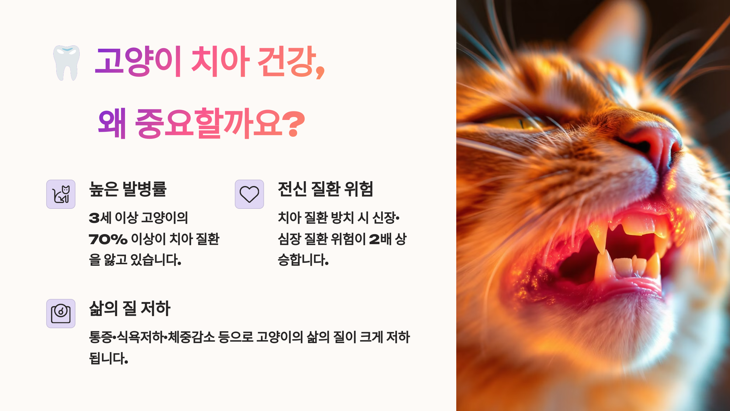 🐱 고양이는 말하지 못하지만, 치아 통증을 매우 심하게 느껴요. 특히 치은염이나 치주염은 식욕 저하, 행동 변화, 무기력증까지 유발할 수 있어요. 실제로 많은 고양이들이 치통 때문에 밥을 못 먹고 말라가기도 해요.