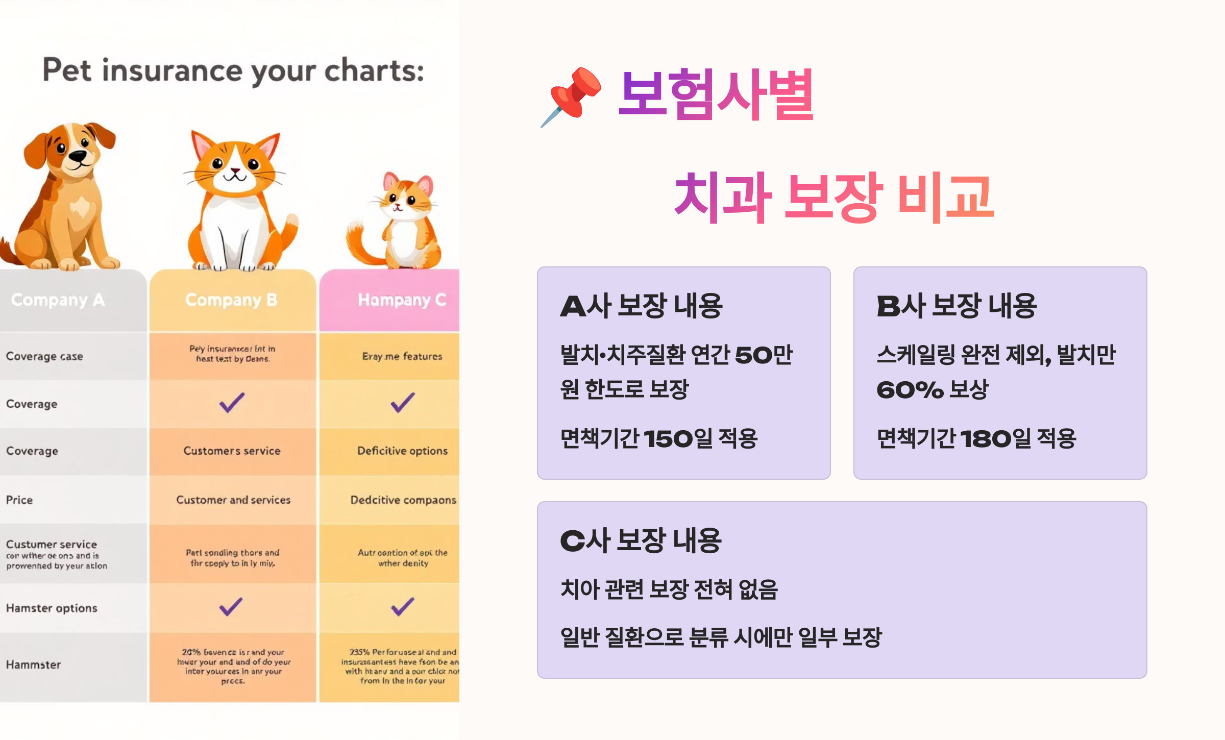 📊 고양이 치과 치료는 보험사마다 보장 여부와 범위가 다르기 때문에 반드시 비교가 필요해요. 어떤 곳은 발치만 보장하고, 어떤 곳은 치은염 진료까지 가능하지만 스케일링은 빠지기도 하죠.