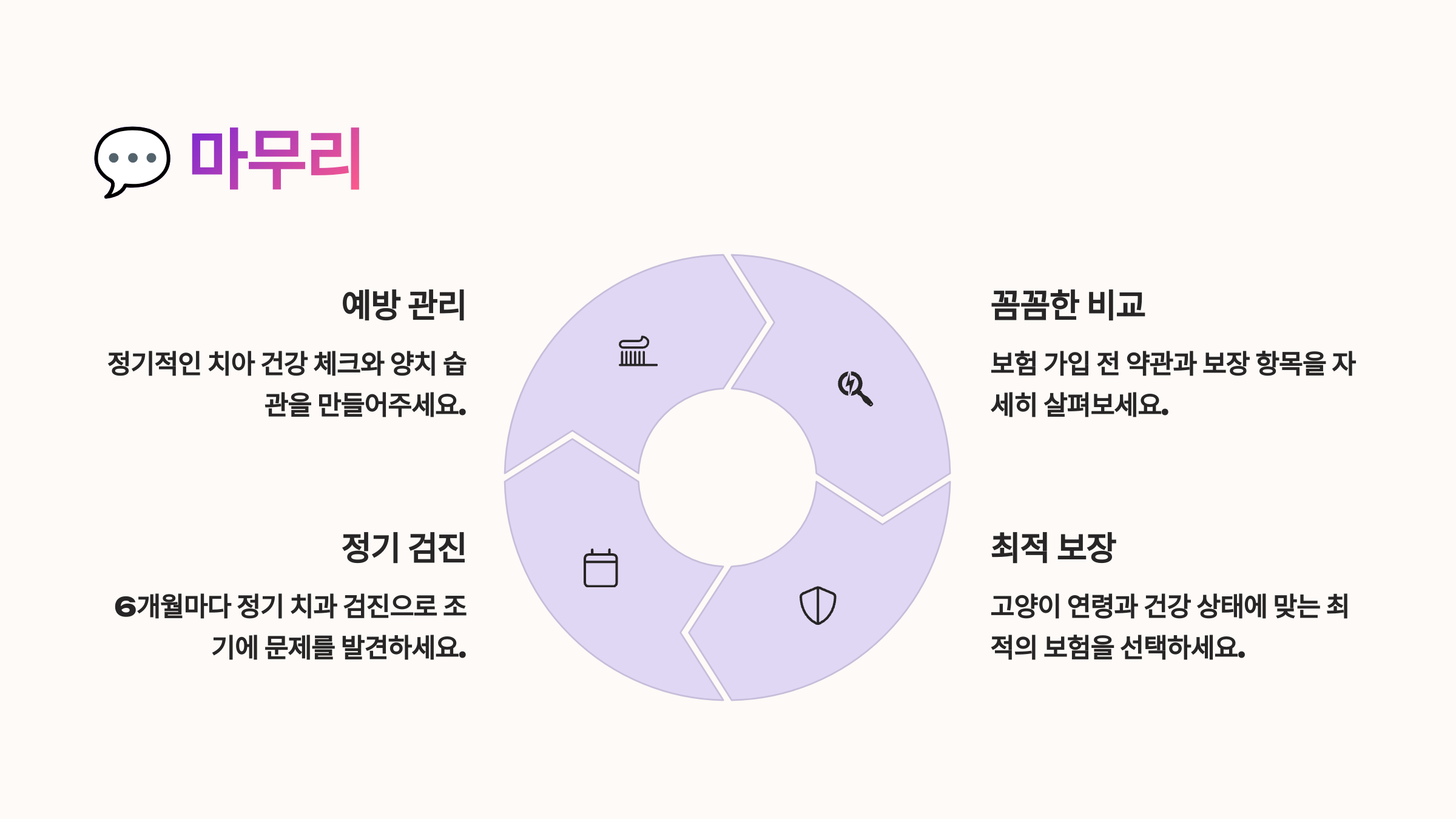 😺 고양이 보험을 고를 땐 단순히 보험료만 보지 말고 '내 고양이의 특성에 맞는 보장 항목이 있는지'를 먼저 체크하는 게 가장 중요해요. 특히 치과 치료는 대부분 기본 보장에서 제외되기 때문에, 더욱 주의가 필요해요.