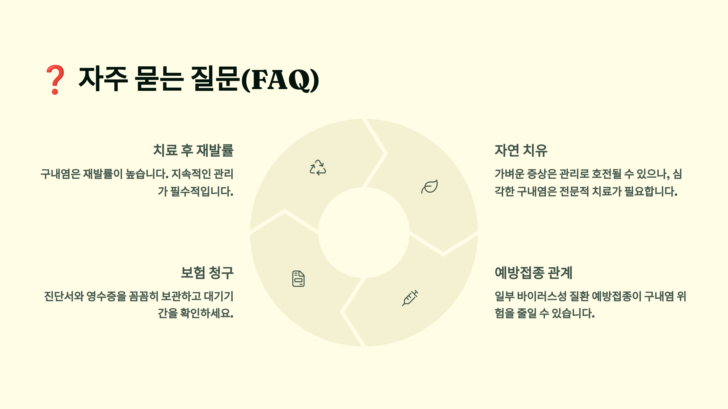 A2. 구내염은 대부분 만성 질환이라 완치보다는 통증 관리와 재발 방지가 목표예요. 전발치 수술 이후 통증에서 벗어나는 경우도 많지만, 꾸준한 관리가 중요해요.