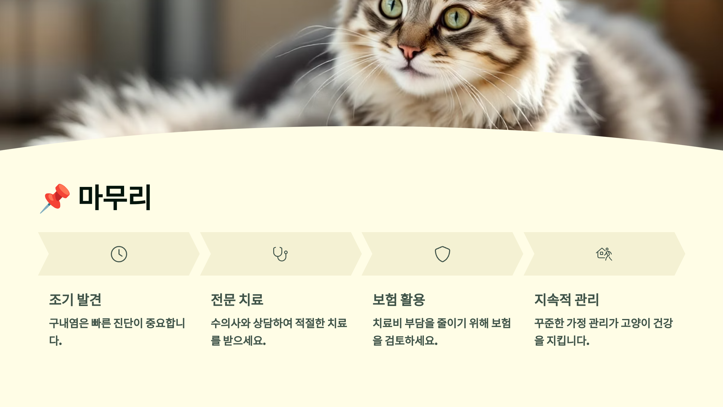 고양이 구내염은 조기 발견이 정말 중요해요. 그래서 보호자들이 평소에 고양이 입 안을 자주 살펴보는 습관을 들이는 게 좋아요. 작은 붉은기나 구취가 시작되었을 때 바로 대처하면 큰 수술을 막을 수 있어요!