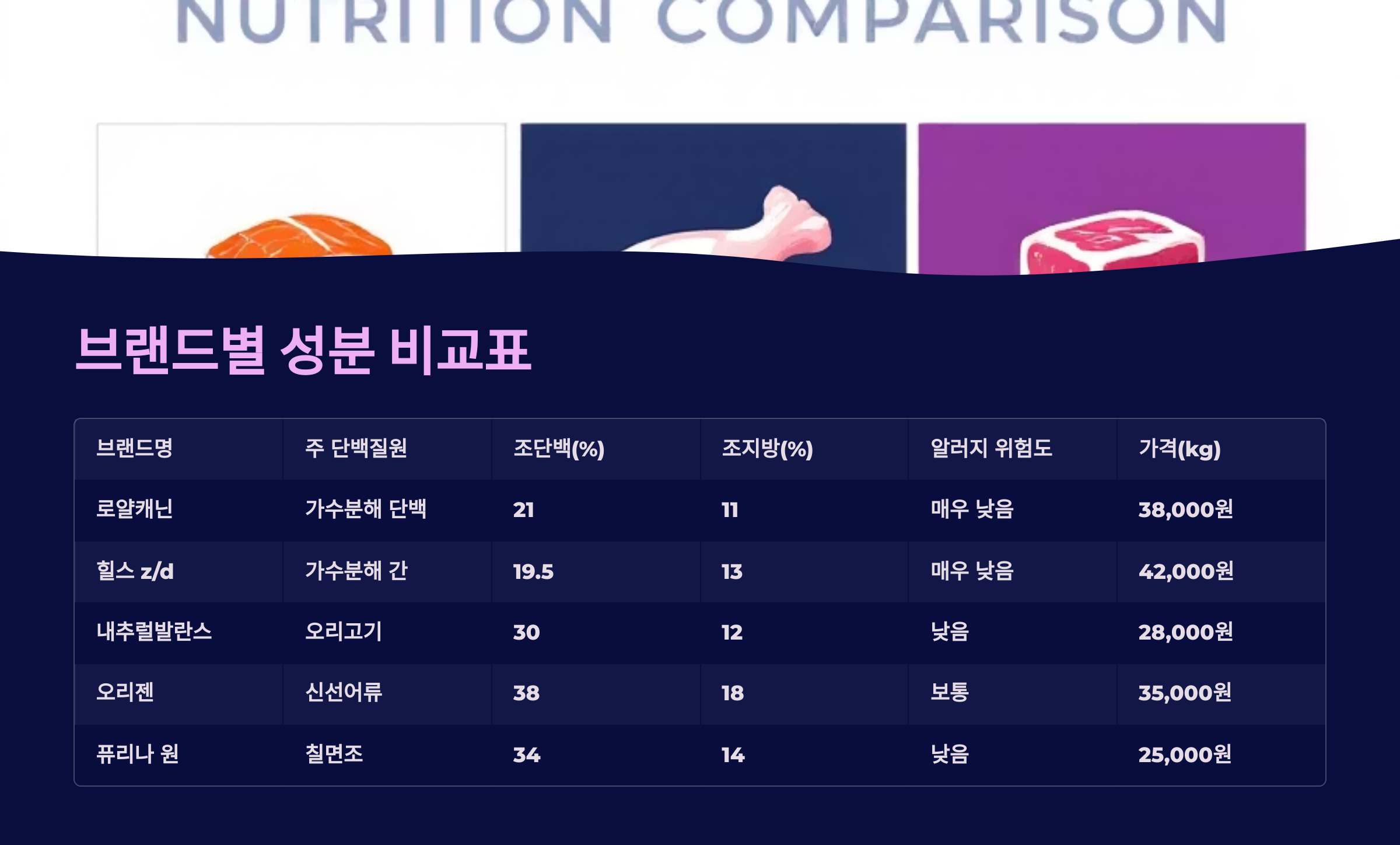 앞서 소개한 저알러지 고양이 사료 5종을 단백질 종류, 탄수화물 공급원, 첨가물 여부, 기능성 성분 등을 기준으로 비교해봤어요. 사료 이름은 익숙해도, 실제 성분표를 보면 크게 다를 수 있거든요! 특히 고양이가 특정 성분에 민감하다면 꼭 비교해봐야 해요. 😼