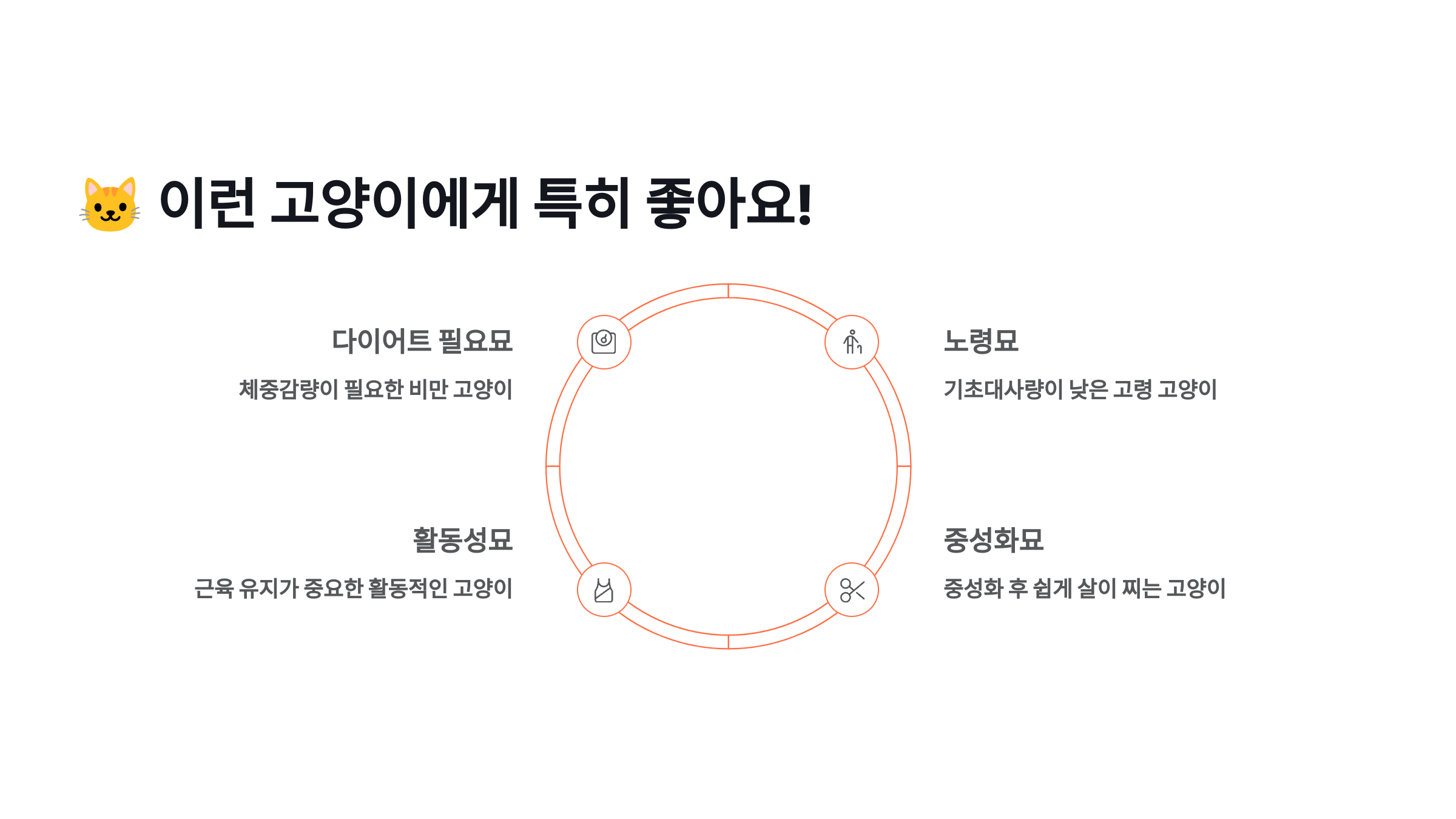 💪 특히 중성화 수술을 한 고양이의 경우, 기초대사량이 감소하기 때문에 살이 쉽게 찌는 반면, 활동량은 줄어드는 경우가 많아요. 이럴 때 고단백 저지방 사료는 살은 덜 찌게 하고, 기초대사량을 유지해주면서 건강하게 체중을 관리할 수 있도록 도와줘요.