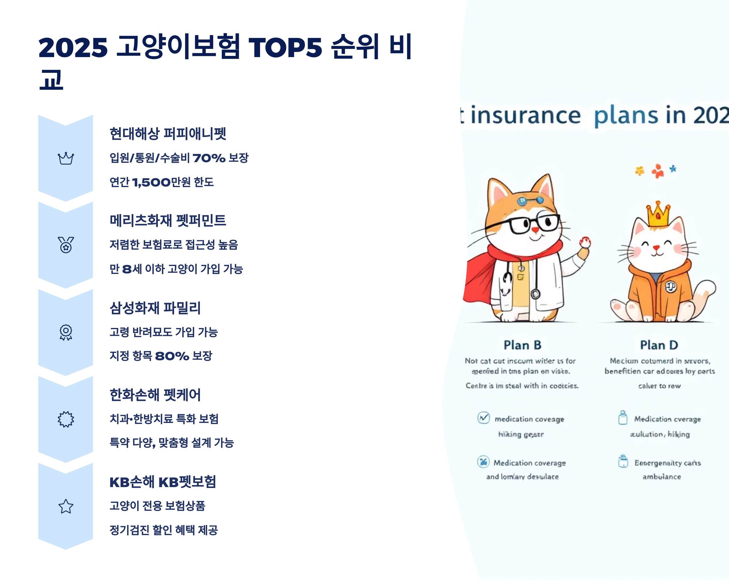 이제 진짜 궁금한 정보죠? 🏆 2025 고양이보험 TOP5 순위 비교 올해 가장 인기 있는 고양이보험 5개 상품을 보장 범위, 가격, 가입자 평점까지 비교해드릴게요! 😽📊