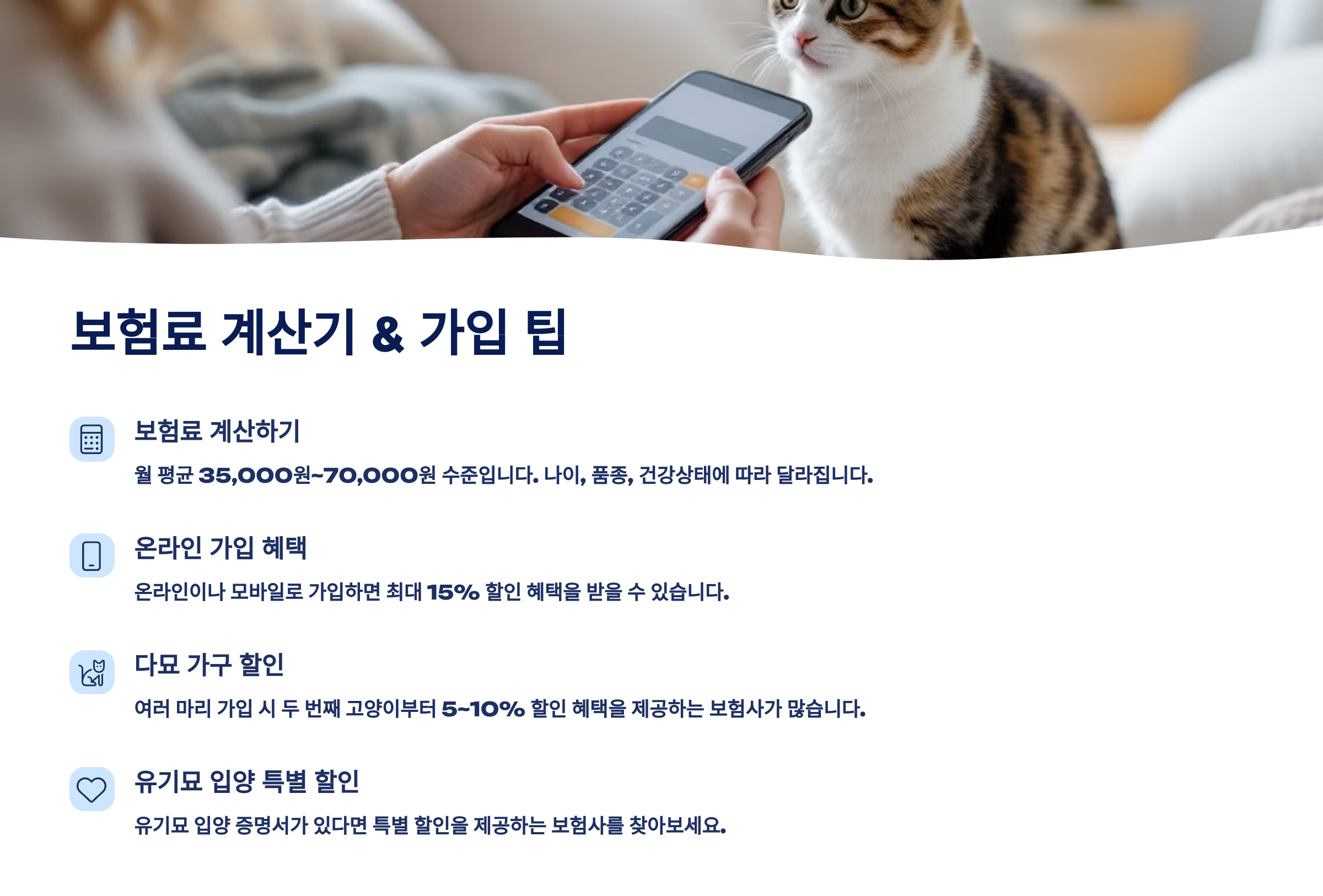 📱 대부분의 보험사 홈페이지에는 실시간 보험료 계산기가 있어요. 냥이 이름, 생년월일, 성별, 품종만 넣으면 바로 예상 견적이 나와요!